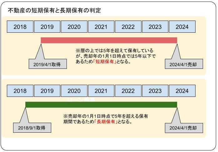 注意すべき点は、下図のように「売却年の1月1日時点で5年を超えているか否か」で長期保有と短期保有を判断するということです。